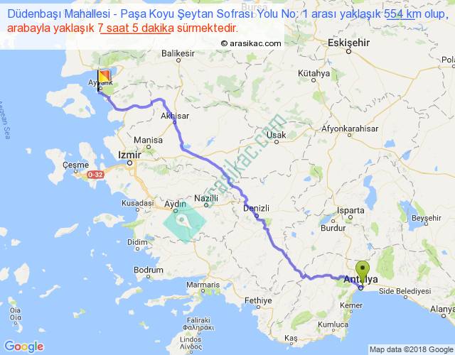 Düdenbaşı Mahallesi - Paşa Koyu Şeytan Sofrası Yolu No: 1 arası yaklaşık olarak 90 km/h ile yukarıda belirtilen sürede olup, iki yerin kuş uçuşu uzaklığı (mesafesi) 441'dir. Eğer belirtilen yerler arasında uçak seferi var ise bu süre uçakla 40 dakika'ya kadar düşebilir. Yolculuk otobüsle 9 saat 12 dakika sürmektedir.