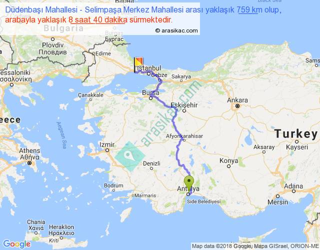 Düdenbaşı Mahallesi - Selimpaşa Merkez Mahallesi arası yaklaşık olarak 90 km/h ile yukarıda belirtilen sürede olup, iki yerin kuş uçuşu uzaklığı (mesafesi) 501'dir. Eğer belirtilen yerler arasında uçak seferi var ise bu süre uçakla 46 dakika'ya kadar düşebilir. Yolculuk otobüsle 11 saat 16 dakika sürmektedir.