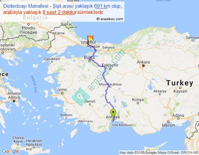 Düdenbaşı Mahallesi - Şişli arası yaklaşık olarak 90 km/h ile yukarıda belirtilen sürede olup, iki yerin kuş uçuşu uzaklığı (mesafesi) 482'dir. Eğer belirtilen yerler arasında uçak seferi var ise bu süre uçakla 44 dakika'ya kadar düşebilir. Yolculuk otobüsle 10 saat 26 dakika sürmektedir.