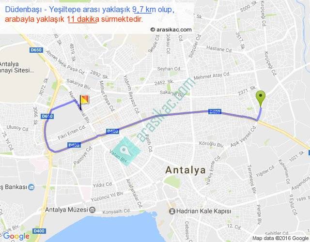 Düdenbaşı - Yeşiltepe arası yaklaşık olarak 90 km/h ile yukarıda belirtilen sürede olup, iki yerin kuş uçuşu uzaklığı (mesafesi) 6'dir. Yolculuk otobüsle 14 dakika sürmektedir.