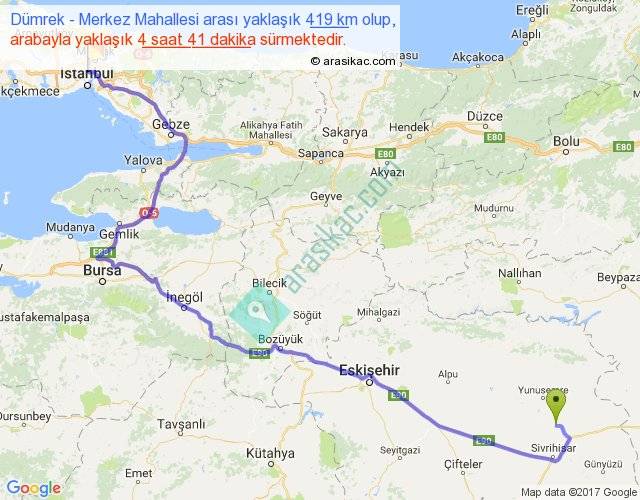 Dümrek - Merkez Mahallesi arası yaklaşık olarak 90 km/h ile yukarıda belirtilen sürede olup, iki yerin kuş uçuşu uzaklığı (mesafesi) 271'dir. Eğer belirtilen yerler arasında uçak seferi var ise bu süre uçakla 25 dakika'ya kadar düşebilir. Yolculuk otobüsle 6 saat 5 dakika sürmektedir.