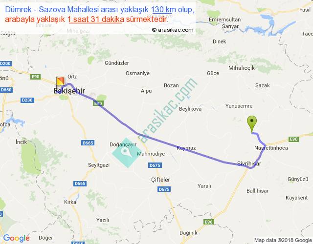 Dümrek - Sazova Mahallesi arası yaklaşık olarak 90 km/h ile yukarıda belirtilen sürede olup, iki yerin kuş uçuşu uzaklığı (mesafesi) 95'dir. Yolculuk otobüsle 1 saat 58 dakika sürmektedir.