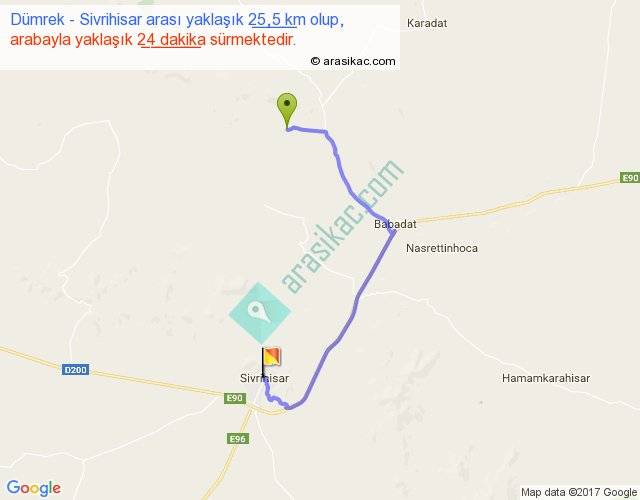 Dümrek - Sivrihisar arası yaklaşık olarak 90 km/h ile yukarıda belirtilen sürede olup, iki yerin kuş uçuşu uzaklığı (mesafesi) 15'dir. Yolculuk otobüsle 31 dakika sürmektedir.