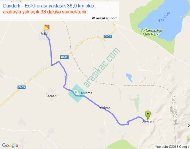Dündarlı - Edikli arası yaklaşık olarak 90 km/h ile yukarıda belirtilen sürede olup, iki yerin kuş uçuşu uzaklığı (mesafesi) 27'dir. Yolculuk otobüsle 49 dakika sürmektedir.