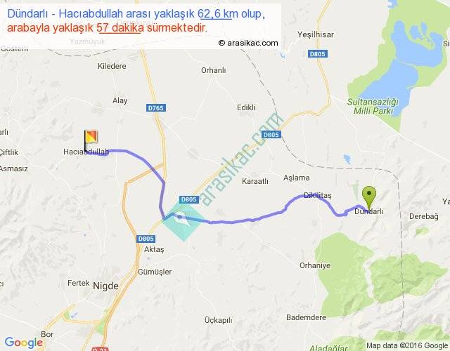 Dündarlı - Hacıabdullah arası yaklaşık olarak 90 km/h ile yukarıda belirtilen sürede olup, iki yerin kuş uçuşu uzaklığı (mesafesi) 49'dir. Yolculuk otobüsle 1 saat 14 dakika sürmektedir.