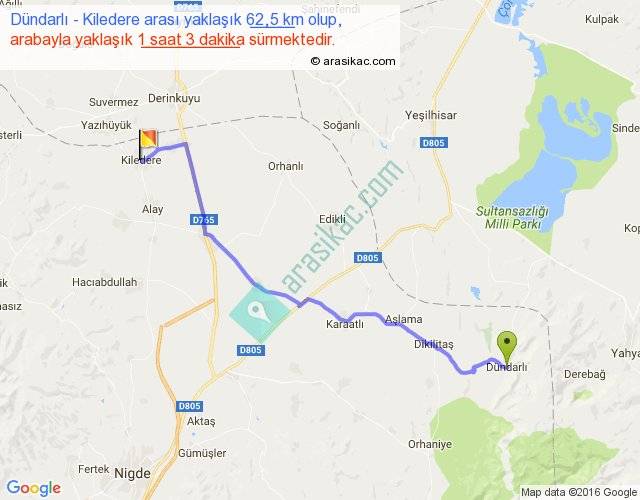 Dündarlı - Kiledere arası yaklaşık olarak 90 km/h ile yukarıda belirtilen sürede olup, iki yerin kuş uçuşu uzaklığı (mesafesi) 50'dir. Yolculuk otobüsle 1 saat 21 dakika sürmektedir.
