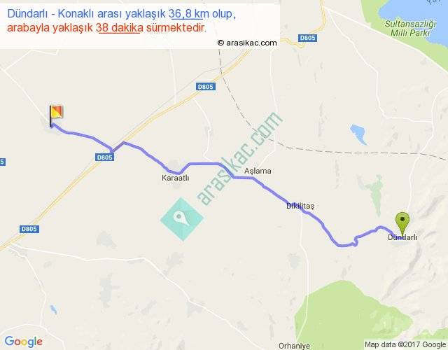 Dündarlı - Konaklı arası yaklaşık olarak 90 km/h ile yukarıda belirtilen sürede olup, iki yerin kuş uçuşu uzaklığı (mesafesi) 31'dir. Yolculuk otobüsle 49 dakika sürmektedir.