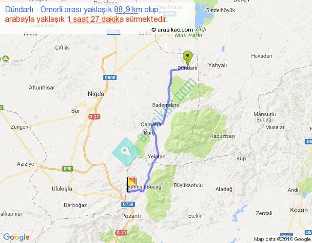 Dündarlı - Ömerli arası yaklaşık olarak 90 km/h ile yukarıda belirtilen sürede olup, iki yerin kuş uçuşu uzaklığı (mesafesi) 68'dir. Yolculuk otobüsle 1 saat 53 dakika sürmektedir.