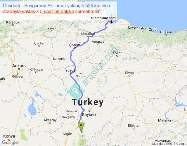 Dündarlı - Sungurbey Sk. arası yaklaşık olarak 90 km/h ile yukarıda belirtilen sürede olup, iki yerin kuş uçuşu uzaklığı (mesafesi) 365'dir. Eğer belirtilen yerler arasında uçak seferi var ise bu süre uçakla 33 dakika'ya kadar düşebilir. Yolculuk otobüsle 7 saat 45 dakika sürmektedir.
