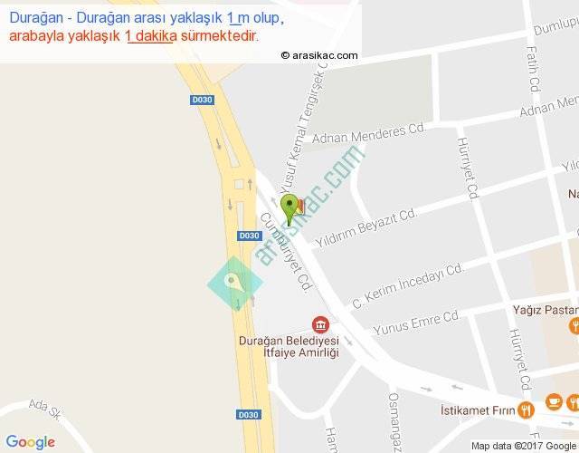 Durağan - Durağan arası yaklaşık olarak 90 km/h ile yukarıda belirtilen sürede olup, iki yerin kuş uçuşu uzaklığı (mesafesi) 0'dir. Yolculuk otobüsle 1 dakika sürmektedir.