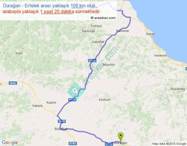 Durağan - Erfelek arası yaklaşık olarak 90 km/h ile yukarıda belirtilen sürede olup, iki yerin kuş uçuşu uzaklığı (mesafesi) 53'dir. Yolculuk otobüsle 1 saat 50 dakika sürmektedir.