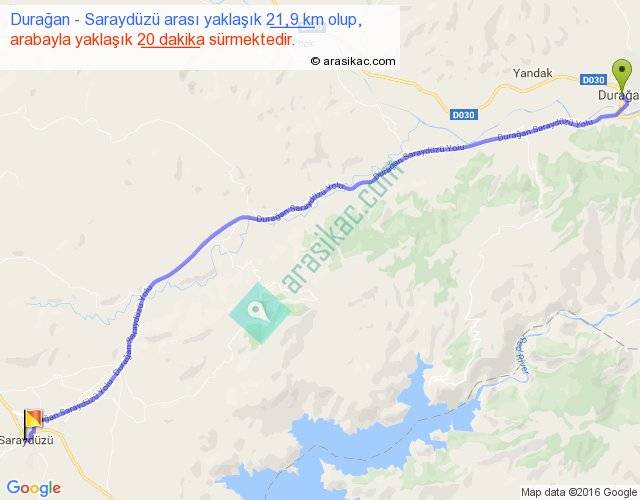 Durağan - Saraydüzü arası yaklaşık olarak 90 km/h ile yukarıda belirtilen sürede olup, iki yerin kuş uçuşu uzaklığı (mesafesi) 20'dir. Yolculuk otobüsle 26 dakika sürmektedir.