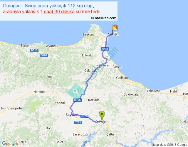 Durağan - Sinop arası yaklaşık olarak 90 km/h ile yukarıda belirtilen sürede olup, iki yerin kuş uçuşu uzaklığı (mesafesi) 68'dir. Yolculuk otobüsle 1 saat 57 dakika sürmektedir.