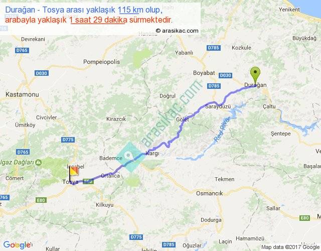 Durağan - Tosya arası yaklaşık olarak 90 km/h ile yukarıda belirtilen sürede olup, iki yerin kuş uçuşu uzaklığı (mesafesi) 95'dir. Yolculuk otobüsle 1 saat 55 dakika sürmektedir.