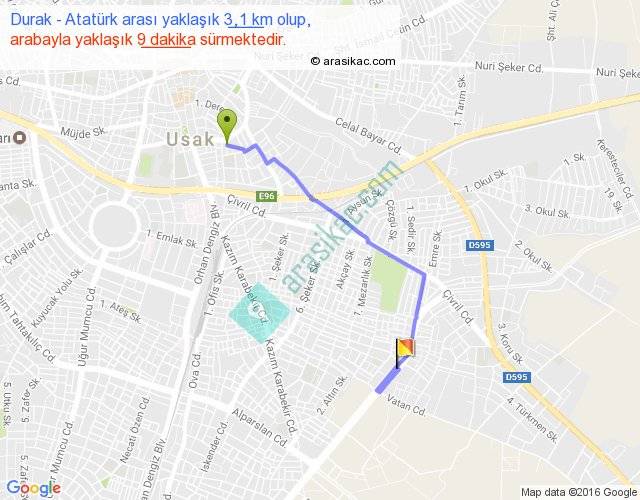 Durak - Atatürk arası yaklaşık olarak 90 km/h ile yukarıda belirtilen sürede olup, iki yerin kuş uçuşu uzaklığı (mesafesi) 2'dir. Yolculuk otobüsle 11 dakika sürmektedir.