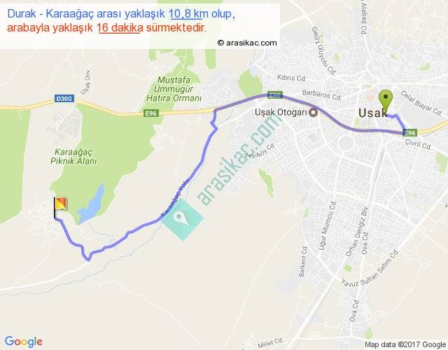 Durak - Karaağaç arası yaklaşık olarak 90 km/h ile yukarıda belirtilen sürede olup, iki yerin kuş uçuşu uzaklığı (mesafesi) 7'dir. Yolculuk otobüsle 20 dakika sürmektedir.