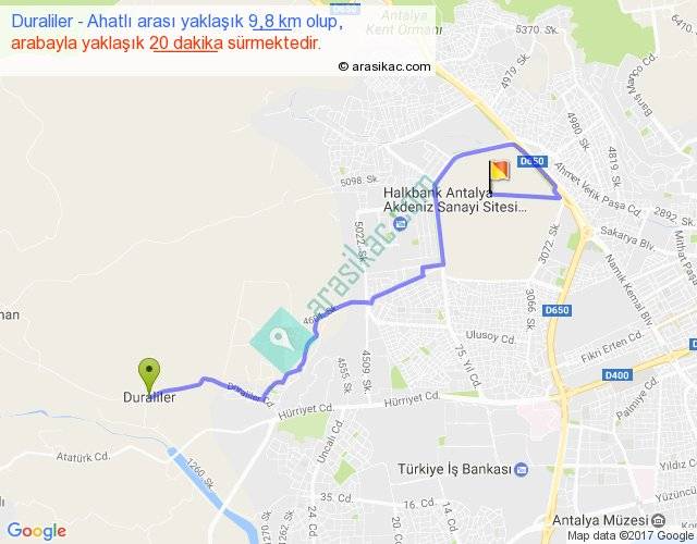 Duraliler - Ahatlı arası yaklaşık olarak 90 km/h ile yukarıda belirtilen sürede olup, iki yerin kuş uçuşu uzaklığı (mesafesi) 6'dir. Yolculuk otobüsle 26 dakika sürmektedir.