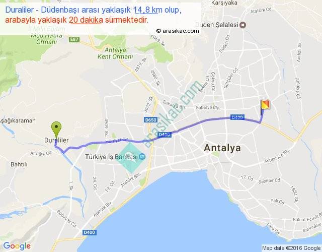 Duraliler - Düdenbaşı arası yaklaşık olarak 90 km/h ile yukarıda belirtilen sürede olup, iki yerin kuş uçuşu uzaklığı (mesafesi) 12'dir. Yolculuk otobüsle 26 dakika sürmektedir.