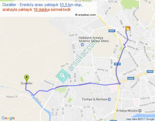 Duraliler - Erenköy arası yaklaşık olarak 90 km/h ile yukarıda belirtilen sürede olup, iki yerin kuş uçuşu uzaklığı (mesafesi) 7'dir. Yolculuk otobüsle 23 dakika sürmektedir.