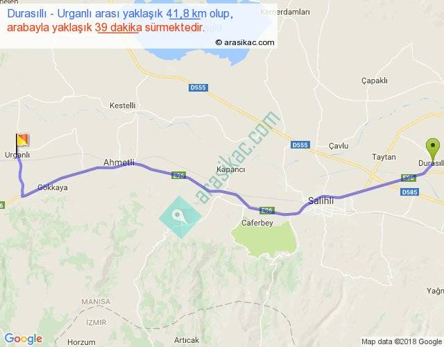 Durasıllı - Urganlı arası yaklaşık olarak 90 km/h ile yukarıda belirtilen sürede olup, iki yerin kuş uçuşu uzaklığı (mesafesi) 36'dir. Yolculuk otobüsle 50 dakika sürmektedir.