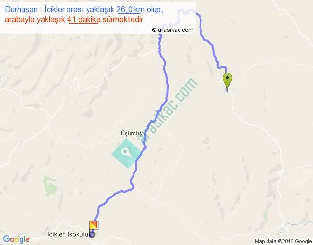 Durhasan - İcikler arası yaklaşık olarak 90 km/h ile yukarıda belirtilen sürede olup, iki yerin kuş uçuşu uzaklığı (mesafesi) 12'dir. Yolculuk otobüsle 53 dakika sürmektedir.