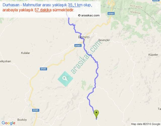 Durhasan - Mahmutlar arası yaklaşık olarak 90 km/h ile yukarıda belirtilen sürede olup, iki yerin kuş uçuşu uzaklığı (mesafesi) 25'dir. Yolculuk otobüsle 1 saat 14 dakika sürmektedir.