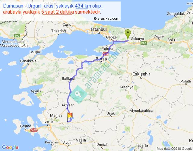 Durhasan - Urganlı arası yaklaşık olarak 90 km/h ile yukarıda belirtilen sürede olup, iki yerin kuş uçuşu uzaklığı (mesafesi) 314'dir. Eğer belirtilen yerler arasında uçak seferi var ise bu süre uçakla 28 dakika'ya kadar düşebilir. Yolculuk otobüsle 6 saat 32 dakika sürmektedir.