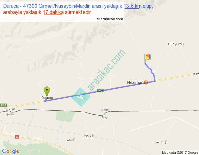 Duruca - 47300 Girmeli Nusaybin Mardin arası yaklaşık olarak 90 km/h ile yukarıda belirtilen sürede olup, iki yerin kuş uçuşu uzaklığı (mesafesi) 10'dir. Yolculuk otobüsle 22 dakika sürmektedir.