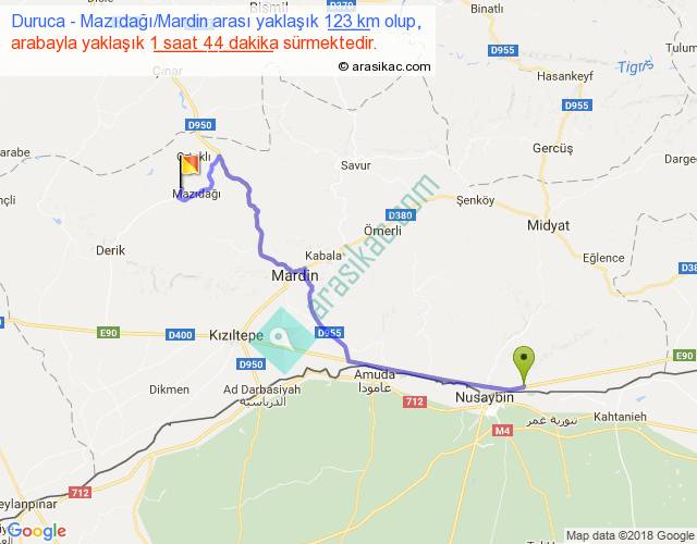 Duruca - Mazıdağı Mardin arası yaklaşık olarak 90 km/h ile yukarıda belirtilen sürede olup, iki yerin kuş uçuşu uzaklığı (mesafesi) 87'dir. Yolculuk otobüsle 2 saat 15 dakika sürmektedir.