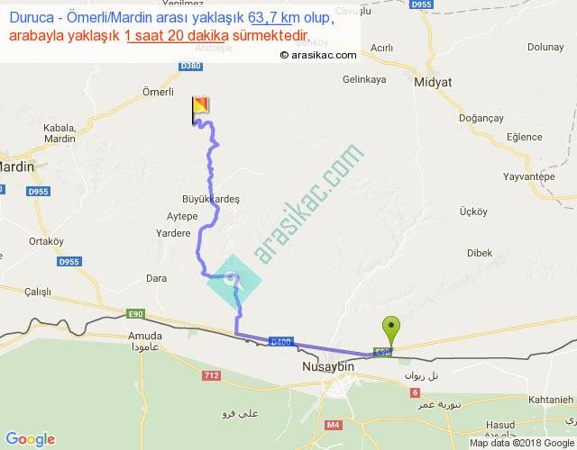 Duruca - Ömerli Mardin arası yaklaşık olarak 90 km/h ile yukarıda belirtilen sürede olup, iki yerin kuş uçuşu uzaklığı (mesafesi) 40'dir. Yolculuk otobüsle 1 saat 44 dakika sürmektedir.