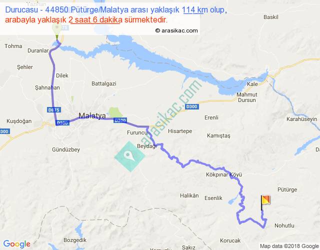 Durucasu - 44850 Pütürge Malatya arası yaklaşık olarak 90 km/h ile yukarıda belirtilen sürede olup, iki yerin kuş uçuşu uzaklığı (mesafesi) 63'dir. Yolculuk otobüsle 2 saat 43 dakika sürmektedir.