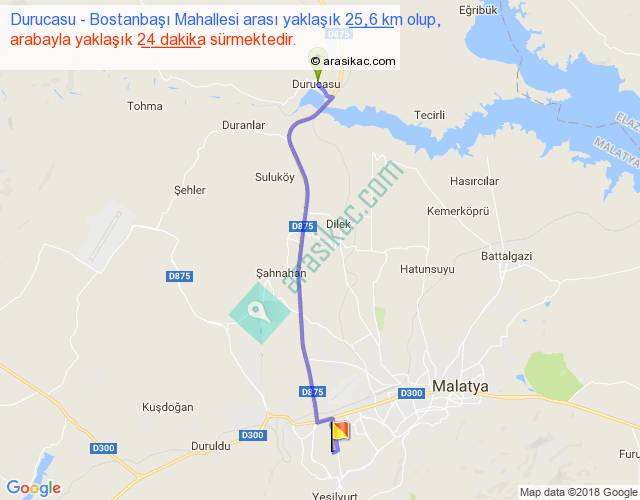Durucasu - Bostanbaşı Mahallesi arası yaklaşık olarak 90 km/h ile yukarıda belirtilen sürede olup, iki yerin kuş uçuşu uzaklığı (mesafesi) 22'dir. Yolculuk otobüsle 31 dakika sürmektedir.