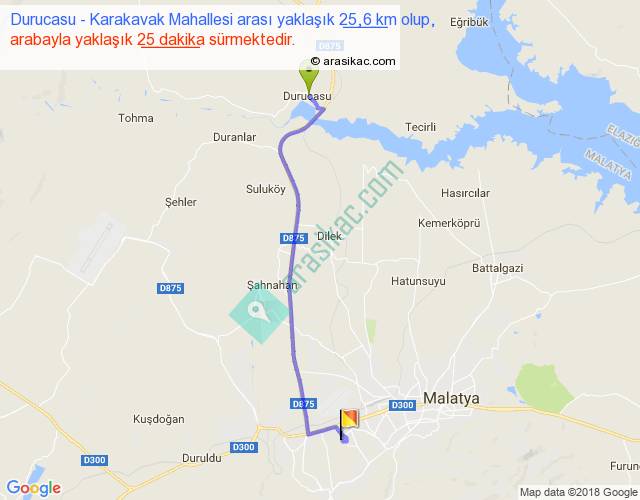 Durucasu - Karakavak Mahallesi arası yaklaşık olarak 90 km/h ile yukarıda belirtilen sürede olup, iki yerin kuş uçuşu uzaklığı (mesafesi) 21'dir. Yolculuk otobüsle 32 dakika sürmektedir.