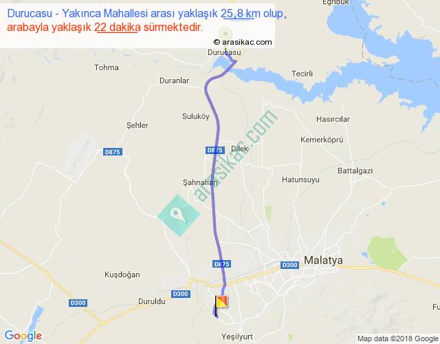 Durucasu - Yakınca Mahallesi arası yaklaşık olarak 90 km/h ile yukarıda belirtilen sürede olup, iki yerin kuş uçuşu uzaklığı (mesafesi) 23'dir. Yolculuk otobüsle 28 dakika sürmektedir.