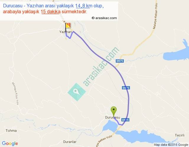 Durucasu - Yazıhan arası yaklaşık olarak 90 km/h ile yukarıda belirtilen sürede olup, iki yerin kuş uçuşu uzaklığı (mesafesi) 10'dir. Yolculuk otobüsle 19 dakika sürmektedir.