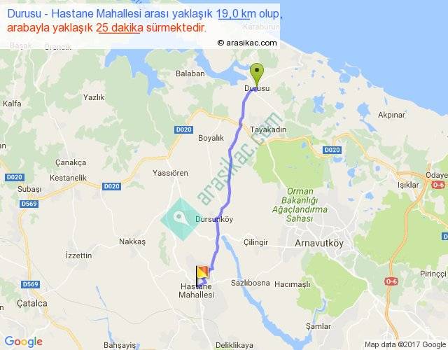 Durusu - Hastane Mahallesi arası yaklaşık olarak 90 km/h ile yukarıda belirtilen sürede olup, iki yerin kuş uçuşu uzaklığı (mesafesi) 17'dir. Yolculuk otobüsle 32 dakika sürmektedir.