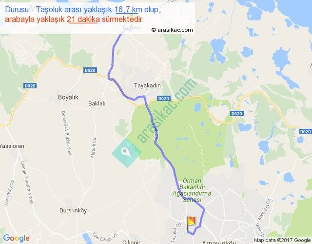 Durusu - Taşoluk arası yaklaşık olarak 90 km/h ile yukarıda belirtilen sürede olup, iki yerin kuş uçuşu uzaklığı (mesafesi) 12'dir. Yolculuk otobüsle 27 dakika sürmektedir.