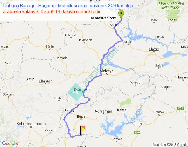 Dutluca Bucağı - Başpınar Mahallesi arası yaklaşık olarak 90 km/h ile yukarıda belirtilen sürede olup, iki yerin kuş uçuşu uzaklığı (mesafesi) 196'dir. Yolculuk otobüsle 5 saat 35 dakika sürmektedir.