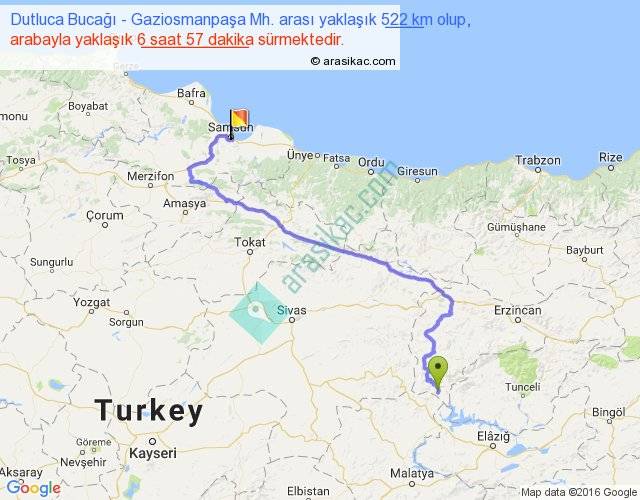 Dutluca Bucağı - Gaziosmanpaşa Mh. arası yaklaşık olarak 90 km/h ile yukarıda belirtilen sürede olup, iki yerin kuş uçuşu uzaklığı (mesafesi) 302'dir. Eğer belirtilen yerler arasında uçak seferi var ise bu süre uçakla 27 dakika'ya kadar düşebilir. Yolculuk otobüsle 9 saat 2 dakika sürmektedir.