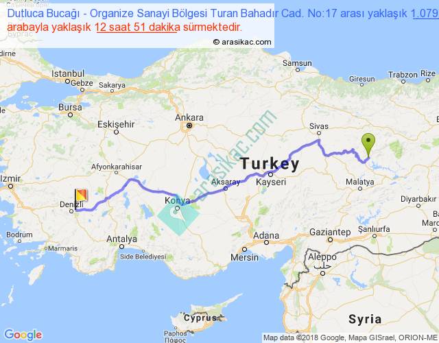 Dutluca Bucağı - Organize Sanayi Bölgesi Turan Bahadır Cad. No:17 arası yaklaşık olarak 90 km/h ile yukarıda belirtilen sürede olup, iki yerin kuş uçuşu uzaklığı (mesafesi) 822'dir. Eğer belirtilen yerler arasında uçak seferi var ise bu süre uçakla 1 saat 15 dakika'ya kadar düşebilir. Yolculuk otobüsle 16 saat 42 dakika sürmektedir.