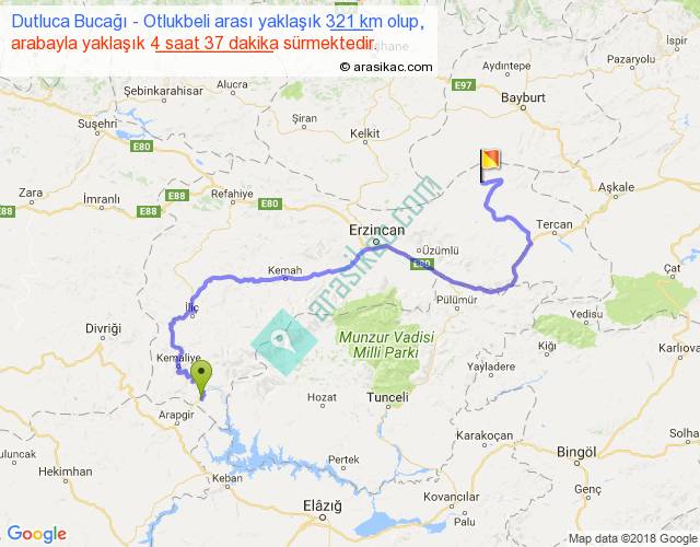 Dutluca Bucağı - Otlukbeli arası yaklaşık olarak 90 km/h ile yukarıda belirtilen sürede olup, iki yerin kuş uçuşu uzaklığı (mesafesi) 152'dir. Yolculuk otobüsle 6 saat 0 dakika sürmektedir.