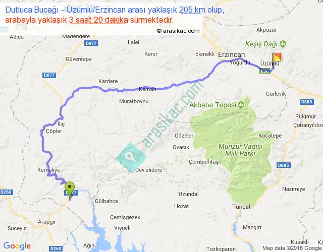 Dutluca Bucağı - Üzümlü Erzincan arası yaklaşık olarak 90 km/h ile yukarıda belirtilen sürede olup, iki yerin kuş uçuşu uzaklığı (mesafesi) 113'dir. Yolculuk otobüsle 4 saat 20 dakika sürmektedir.