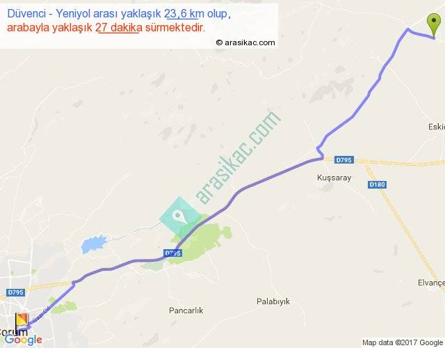 Düvenci - Yeniyol arası yaklaşık olarak 90 km/h ile yukarıda belirtilen sürede olup, iki yerin kuş uçuşu uzaklığı (mesafesi) 21'dir. Yolculuk otobüsle 35 dakika sürmektedir.