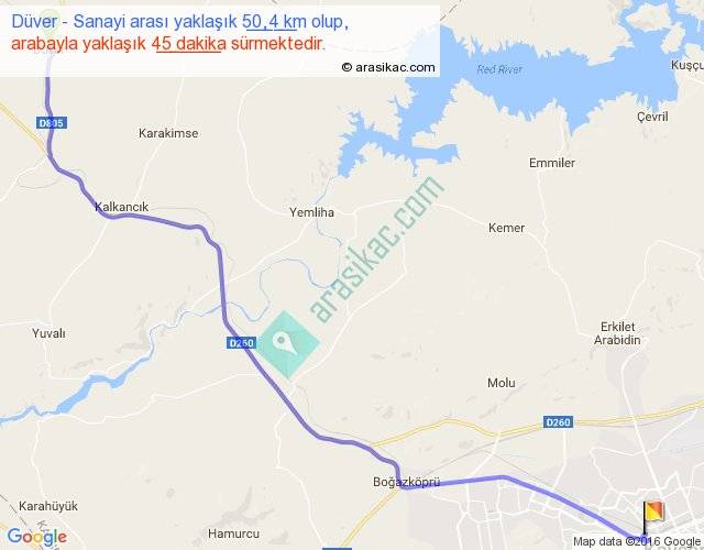 Düver - Sanayi arası yaklaşık olarak 90 km/h ile yukarıda belirtilen sürede olup, iki yerin kuş uçuşu uzaklığı (mesafesi) 41'dir. Yolculuk otobüsle 58 dakika sürmektedir.