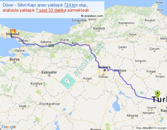 Düver - Silivri Kapı arası yaklaşık olarak 90 km/h ile yukarıda belirtilen sürede olup, iki yerin kuş uçuşu uzaklığı (mesafesi) 569'dir. Eğer belirtilen yerler arasında uçak seferi var ise bu süre uçakla 52 dakika'ya kadar düşebilir. Yolculuk otobüsle 9 saat 47 dakika sürmektedir.