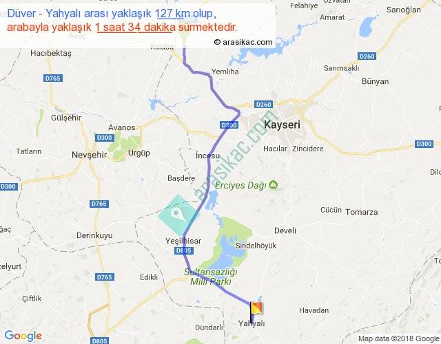 Düver - Yahyalı arası yaklaşık olarak 90 km/h ile yukarıda belirtilen sürede olup, iki yerin kuş uçuşu uzaklığı (mesafesi) 98'dir. Yolculuk otobüsle 2 saat 2 dakika sürmektedir.