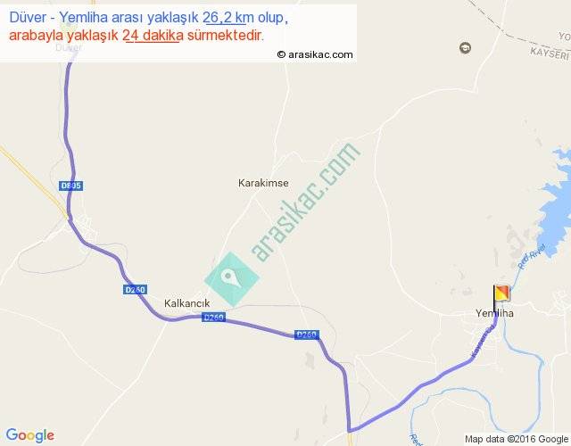 Düver - Yemliha arası yaklaşık olarak 90 km/h ile yukarıda belirtilen sürede olup, iki yerin kuş uçuşu uzaklığı (mesafesi) 17'dir. Yolculuk otobüsle 31 dakika sürmektedir.
