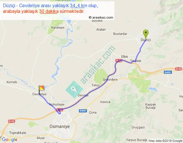 Düziçi - Cevdetiye arası yaklaşık olarak 90 km/h ile yukarıda belirtilen sürede olup, iki yerin kuş uçuşu uzaklığı (mesafesi) 25'dir. Yolculuk otobüsle 39 dakika sürmektedir.