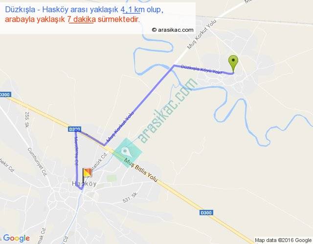 Düzkışla - Hasköy arası yaklaşık olarak 90 km/h ile yukarıda belirtilen sürede olup, iki yerin kuş uçuşu uzaklığı (mesafesi) 3'dir. Yolculuk otobüsle 9 dakika sürmektedir.