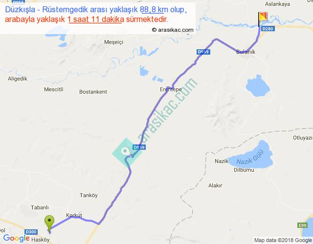 Düzkışla - Rüstemgedik arası yaklaşık olarak 90 km/h ile yukarıda belirtilen sürede olup, iki yerin kuş uçuşu uzaklığı (mesafesi) 71'dir. Yolculuk otobüsle 1 saat 32 dakika sürmektedir.